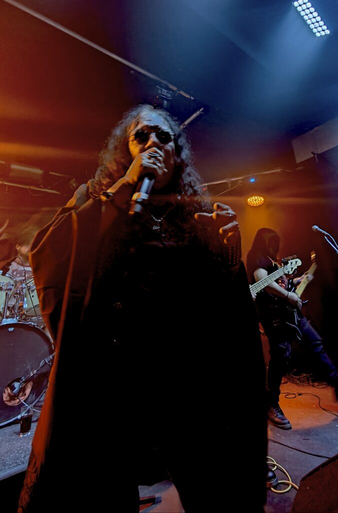 Zo zijn we inmiddels al een dik uur onderweg en van moeheid is nog geen spoor te bekennen want het publiek gaat volledig op in de muziek. Maar wat wil je ook met nummers als het nieuwe Seek out you Sins of stampers uit het verleden als Pandemonium en Black Cathedral, drink and you’ll will see… Er komt een halve liter bier richting het podium en James neemt een slok. Daar knap je inderdaad van op. Tijdloze muziek die een groter publiek verdiend. Dan komt onvermijdelijk het einde in zicht. Zo geeft Larry aan dat nu het moment is gekomen dat ze even het podium af zouden moeten gaan. Maar aangezien de backstage aan de andere kant van het pand is gaat dat een beetje moeilijk. Een voorstel ronde wordt gegeven waarna James aangeeft al 42 jaar samen te zijn met Larry, op een platonische manier dan.