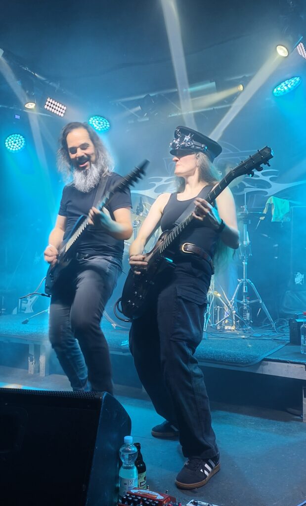 Er wordt overigens uitermate vakkundig gemusiceerd. Hier staan een stel ervaren rotten. Hoewel is gitarist Alan DeLeon Jr. een nieuw gezicht. Op het laatste album liet hij zijn kunsten al horen. Nu op het podium is te zien dat hij een energieke aanwinst is. Onder toeziend en goedkeurend oog tovert hij deftige riffs en pompeuze solo’s tevoorschijn waar Larry uiteraard op aansluit. Dit wordt ondersteund door een zeer dergelijke interim ritmesessie. Zo heeft drummer Alex Erhardt zijn positie wel enigszins verdedigd tegenover Michael Lewis die wegens werkverplichtingen de oversteek niet heeft gemaakt. Op bas is Matej Sušnik present die al vaker met Jamers Rivera heeft opgetreden. Want ook Garrick Smith is niet aanwezig, een trouwerij wordt verteld.